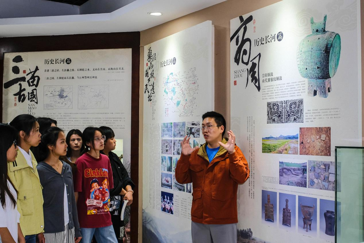 9月22日,公司党委组织各族师生代表参观公司鄂南文化展览馆。鄂南文化研究中心赖建东老师带领同学们步入历史长河,从崇阳的上古三苗到药姑山的古瑶文化,再到三国时期火烧赤壁、抗日时期的“八百壮士”之乡,在赖老师的介绍下,同学们兴致盎然地先后深入“非物质文化遗产”、“农耕文化”等展厅,观看了青釉魂瓶、花雕古床,以及濒临失传的鄂南民间乐器——赤壁脚盆鼓等藏品。大家跟随赖老师的步伐来到“洞茶文化”展厅。作为青砖茶发源地——羊楼洞古镇,曾是茶马古道的重要起点之一,边销茶主力军。有新疆员工抱起青砖茶,细细一味,竟然是家乡的味道,这场与时代的对话、与历史的交锋,使得每一位员工感触颇深。