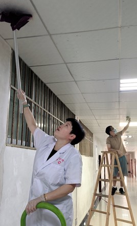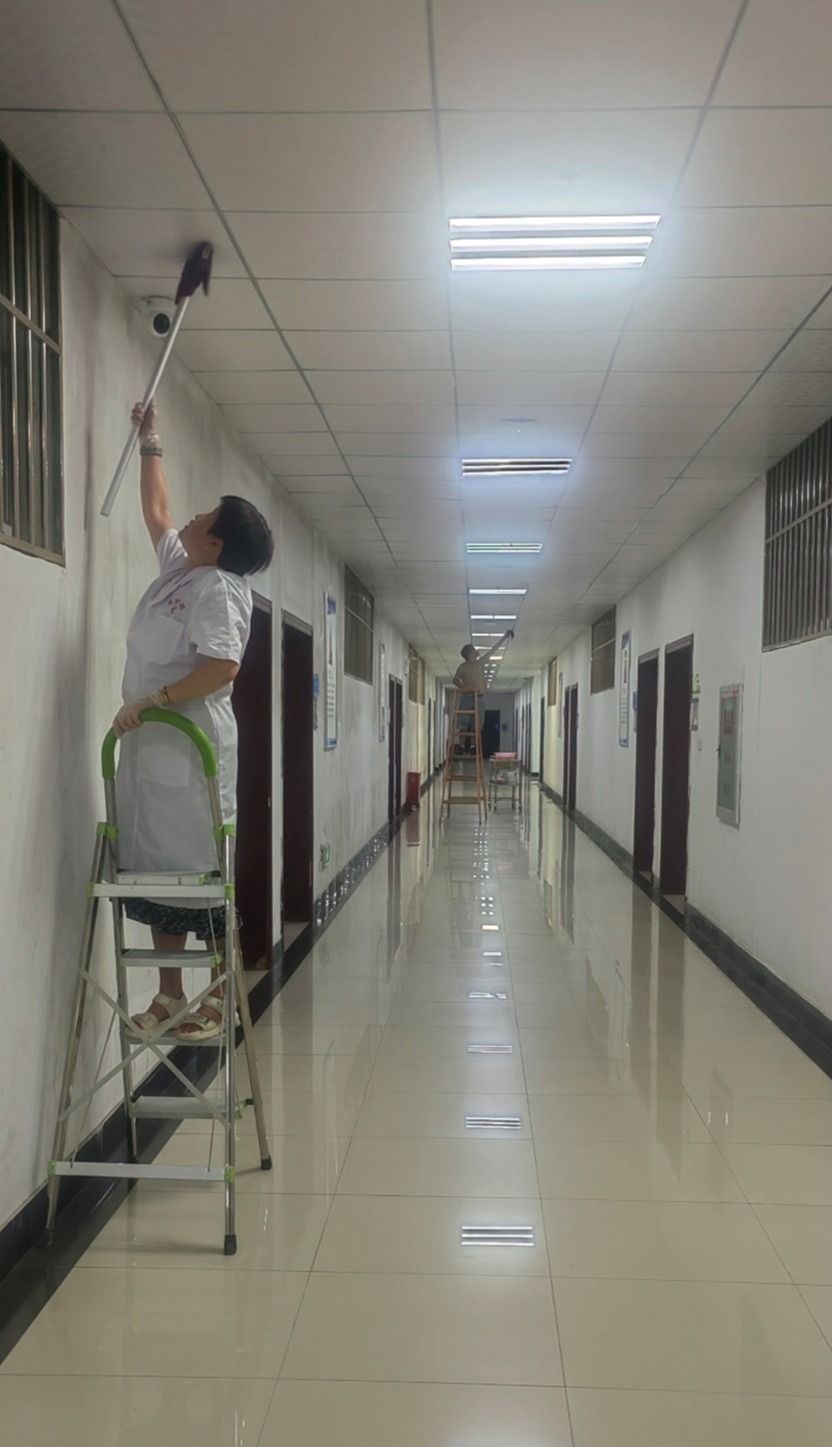 为了维护中心环境的干净整洁,高级实验师周云带领一名员工,不辞辛苦,连续奋战几天,在高梯不停上下,将实训中心几百块吊顶铝扣板进行拆卸和擦拭,直至每一块干净明亮。而她,每天满头大汗,却依然洋溢灿烂的笑容。