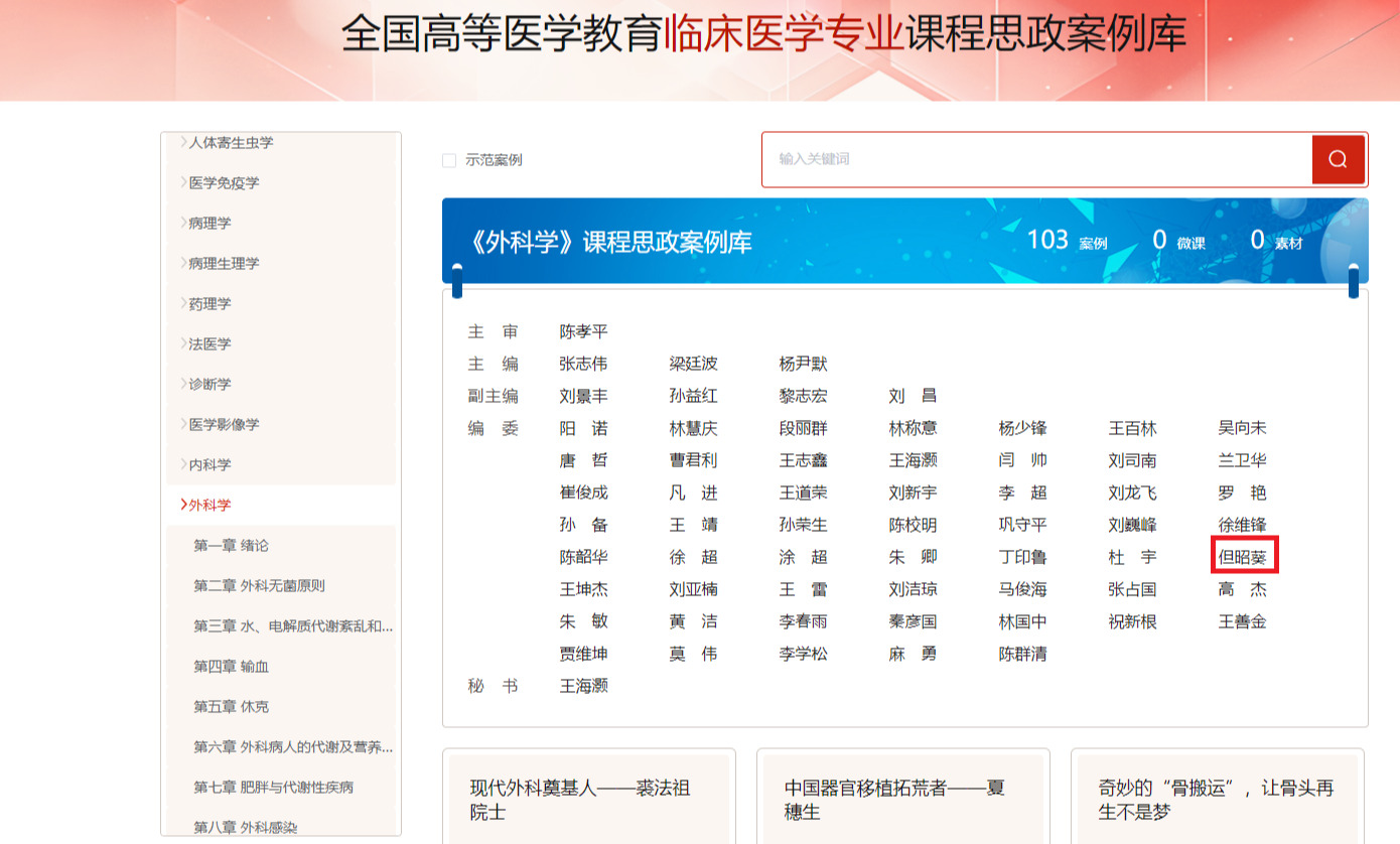 (通讯员:但昭葵)日前,由人民卫生出版社组织,钟南山、李兰娟等院士领衔编写的“全国高等医学教育临床医学专业课程思政案例库”已正式上线发布。意昂体育教师但昭葵参加了钟南山院士领衔编写的《外科学》课程思政案例库的编写,“从中文和中医的角度追寻前人认识疝的历史”和“古今治疗腹外疝的艰辛探索历程”两个案例成功入选《外科学》课程思政案例库。