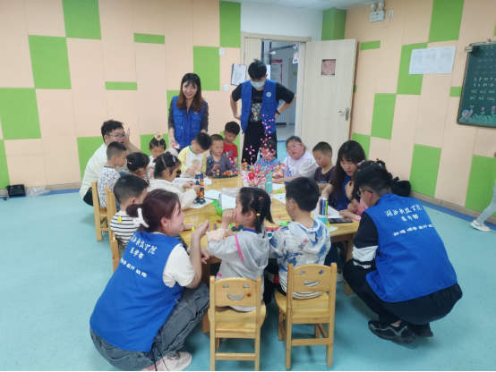 (志愿者和小朋友一起玩玩具、做手工、画画)
