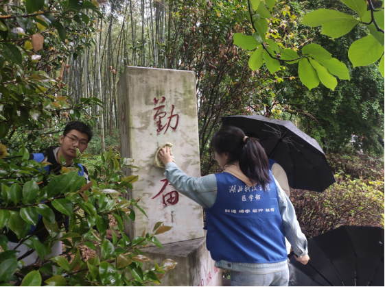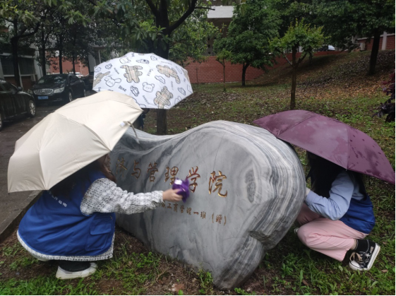 活动过程中,志愿者们认真仔细地清理雕像周围的垃圾,除去雕塑上的落叶与灰尘,对雕像进行擦拭。每位同学自备抹布和水桶,以组为单位前往自己所负责的区域,用干抹布掸去雕像上的浮尘,再用湿抹布进行进一步的清洁。志愿者们认真负责,用合适的力道擦拭雕像,保护雕像完整。
