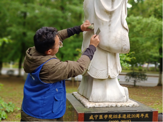 活动有条不紊地进行着,天气的寒冷未能磨灭志愿者们的热情与投入。清洁过程中,大家相互配合,认真负责,不怕脏,不怕累,对雕像进行了全面细致的清洁,做到卫生清理无遗漏。参与活动的志愿者们都做到身体力行,对雕像及周围进行全面的清理,擦去雕像和建筑上的浮尘,还原它们最初的样貌,也为同学们提供舒适的校园环境。
