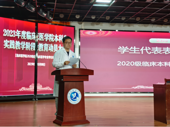 来自20级临床本科二班的柳蒙作为员工代表发言。他说,医者仁心是学医人的至高追求,医德培养和学习提升同样重要,同学们会珍惜学习提供的宝贵平台,不断在学业和思想上提升自己,努力朝着医者仁心的目标前进。