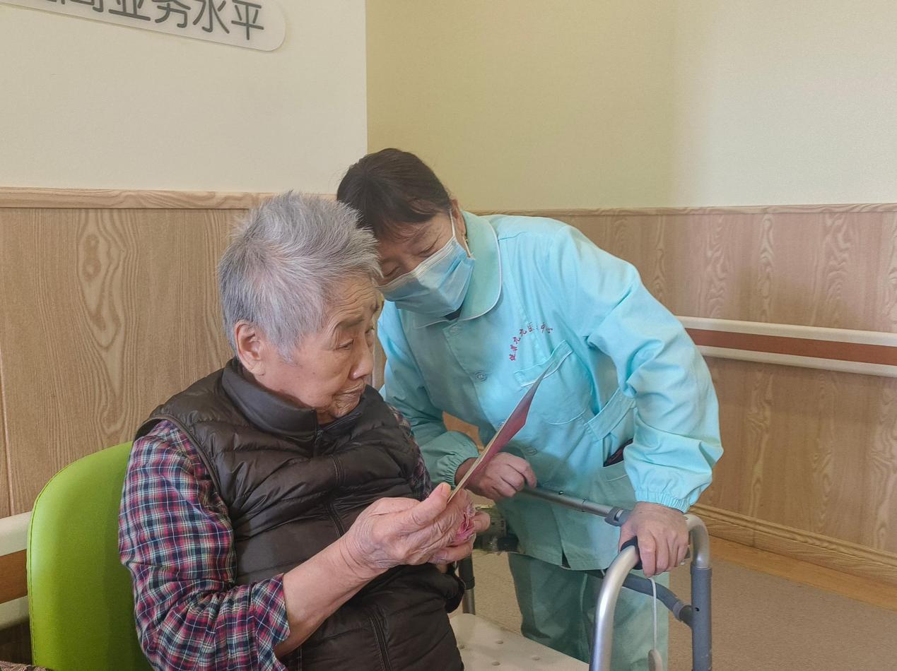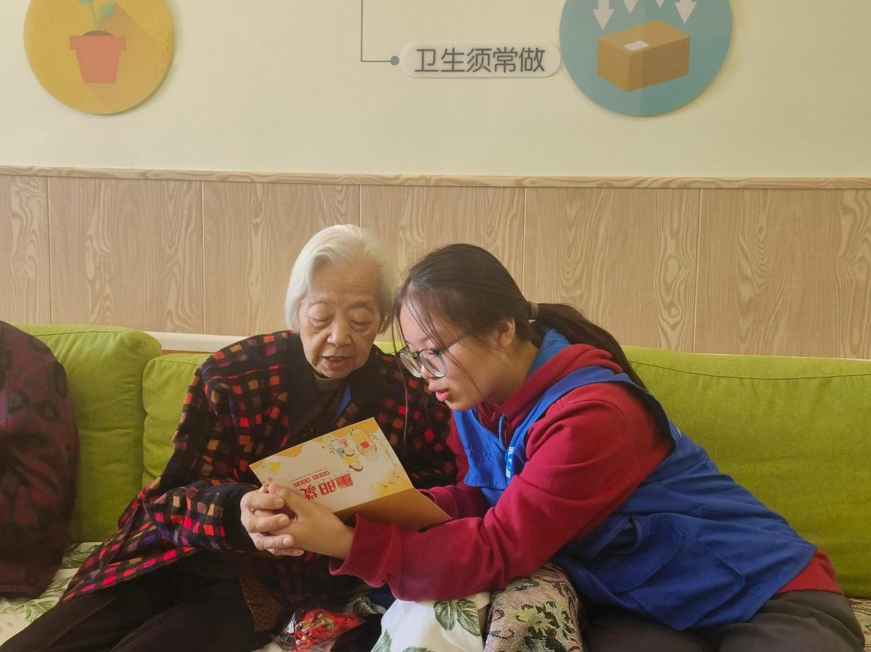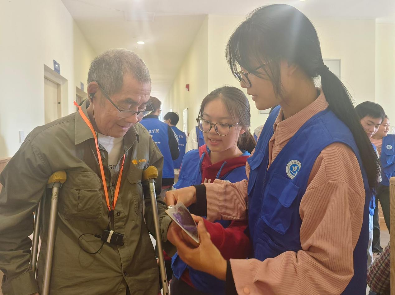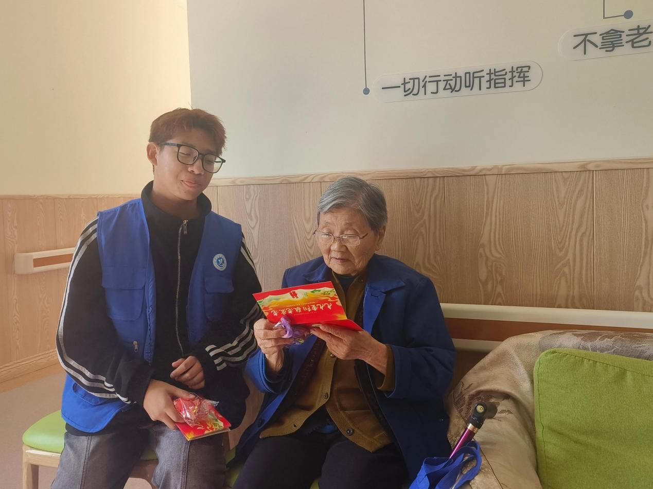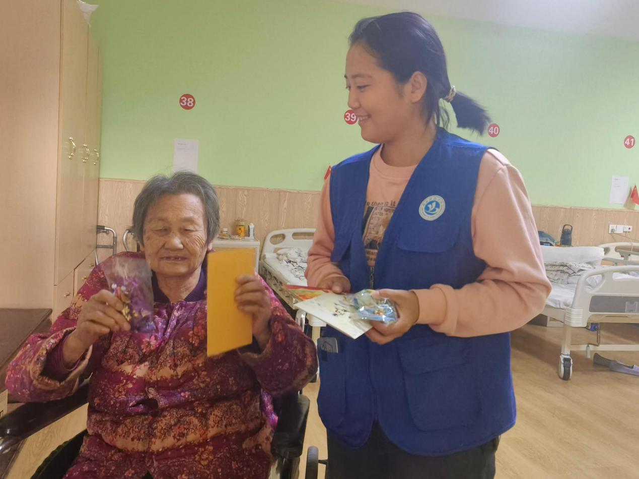 最后志愿者们汇聚大厅,与老人们开展暖心小游戏,如反应能力挑战,老人们积极配合,笑逐颜开,志愿者们拿出准备好的贺卡和香囊,送给老人们,考虑到贺卡上的字太小,老人们可能看不清,于是志愿者们在送贺卡时为他们读上面的文字,并解释香囊的功效,志愿者们的用心、耐心、细心如涓涓细流温暖着老人们心田。