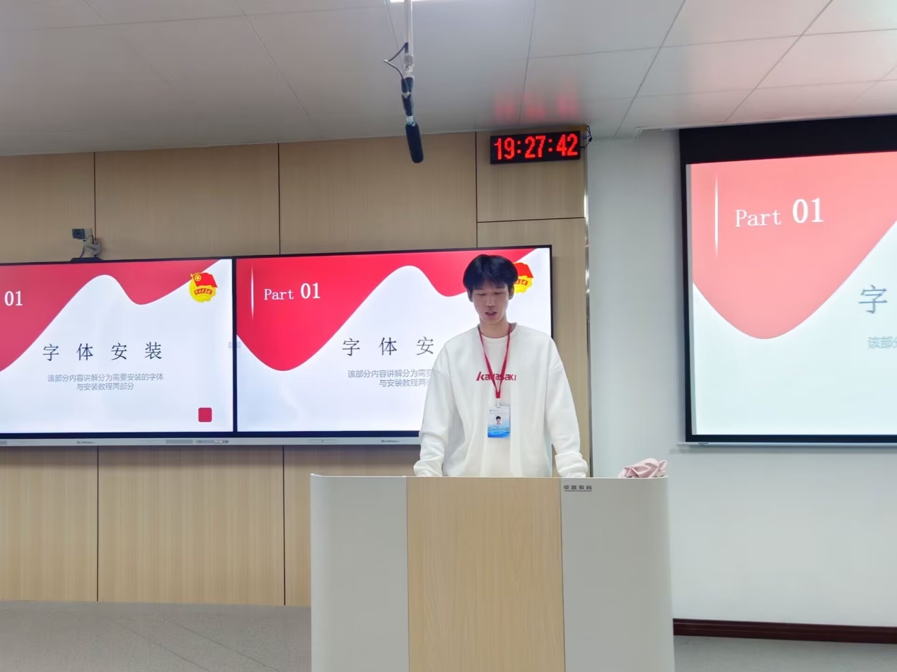 大会进入第二章,宣传部负责人对相关工作进行介绍。主要内容为新闻稿格式、拍照要求两部分,并以实例展示了两者正确的形式,为各班宣传委员的工作树立了标杆,与此同时,为便于工作开展,宣传部对指定字体的安装过程进行了细致讲解。