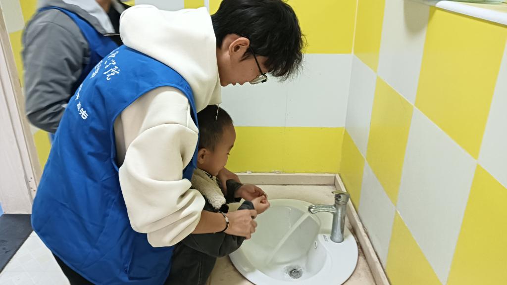 志愿者们充分发挥医员工优势,在游戏结束后,给小朋友们讲一些日常防护小知识,还会手把手教“七步洗手法”,在小朋友心中种下勤洗手、爱干净的种子,有了志愿者的帮助,小朋友的洗手姿势更正确了,洗手频率更高了。