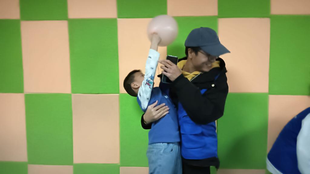 在此期间,小朋友们不仅会和志愿者们比赛,看谁吹的气球又圆又大,还会调皮地将气球举过志愿者的头顶,开心地说:“气球比哥哥高……”小朋友们抱着五颜六色的气球在教室里边跑边笑的画面,也触动着志愿者的心弦。