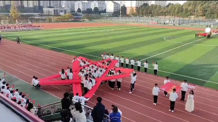 “循着光照的方向……”随着歌曲唱响,同学们一同挥舞着手中的国旗,后排的同学拉开红色绸缎,展开后映入眼帘的是一面鲜红的五星红旗,正如同学们心中红色的种子正在长大,长成那一棵棵参天的大树。紧接着,五条红色绸缎随着队员的变换拼接成一个巨大的五角星,同学们则在星星的空隙中探出头来,挥舞着手中的红旗。