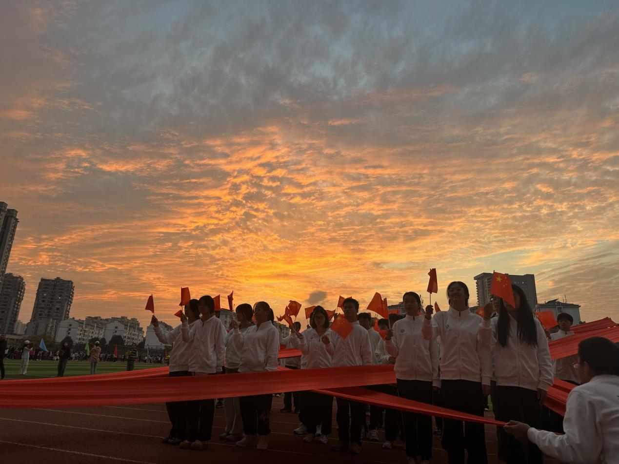 回想同学们训练时,相互交流,共同商讨,贡献自己的智慧。令人感触颇深的是同学们下午训练时,同学们的脸上映照着红色的晚霞,鲜红的五角星迎上落日的余晖,庄严的国旗立于光晕之中,尽情的展现着中国红的美丽,这一刻,向光而生。