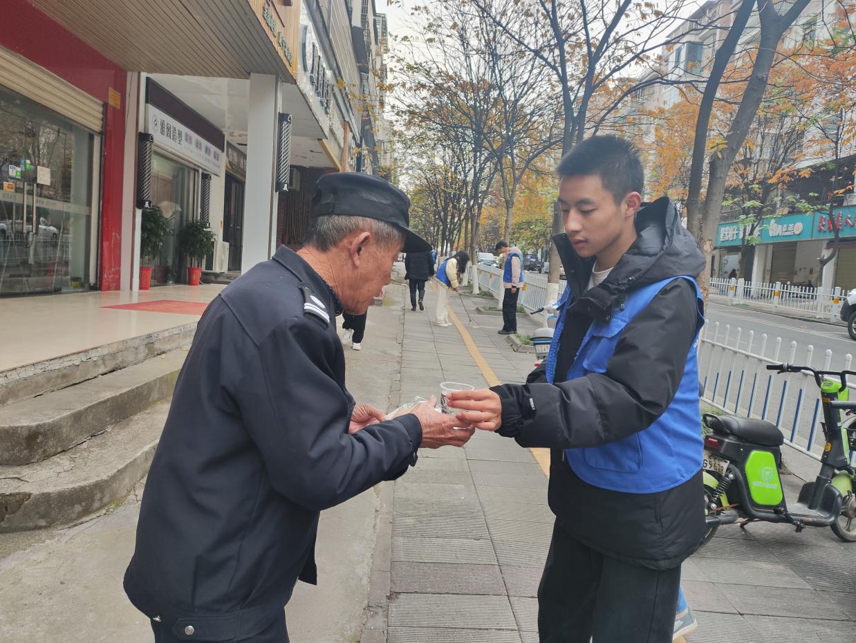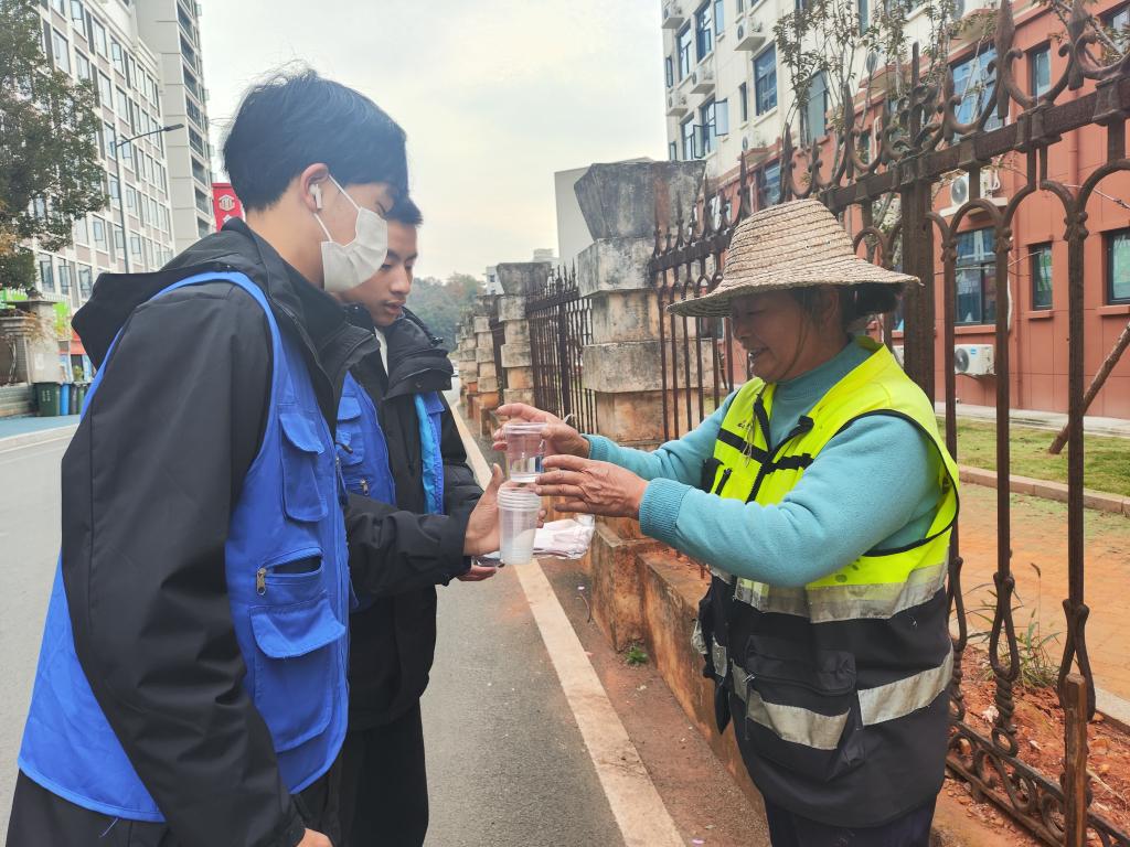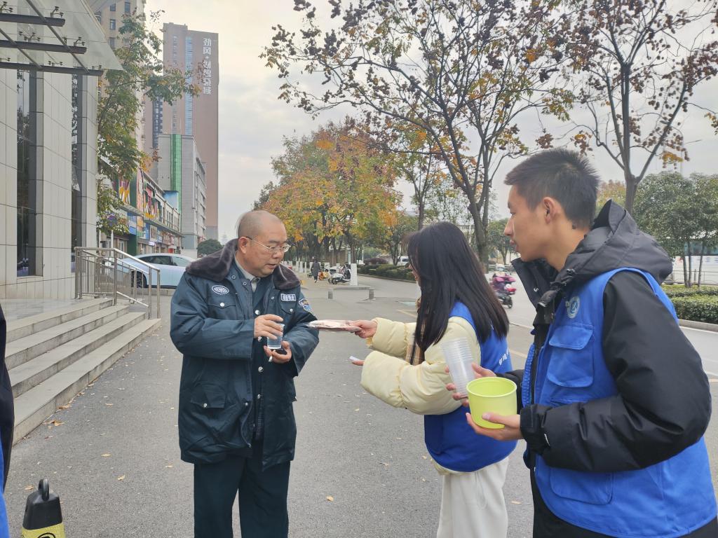 在与保安叔叔们的交流中,志愿者们了解到他们日复一日的坚守,在岗位前管理门禁,在活动中维持秩序,在夜晚里巡逻警戒……他们夜以继日的付出守护着平安校园,当志愿者们将热水递到他们手上时,他们不停地夸奖,高竖着的大拇指流露出他们的赞许,也温暖了每位志愿者的心。