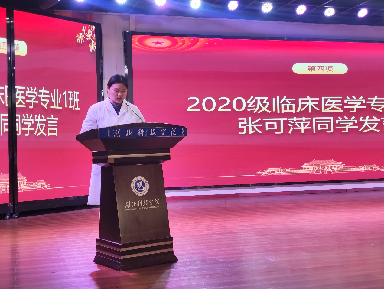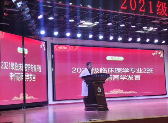 然后由2021级临床医学专业2班李忻蔚同学代表发言。她分享过去几年中的学习经历和成果,并鼓励全体同学认真钻研学习,巩固基础医学知识,尽早适应从理论学习到实践操作的转变,向优秀医员工看齐。