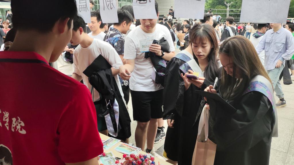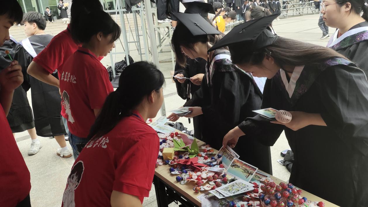 在拍照间隙,不断有候场的毕业生来到志愿服务点前,领取定制明信片和糖果,糖果的甜蜜代表着母校对毕业生的祝福,明信片的定制为了让毕业生们将对母校的记忆装进行囊,满载着母校的期许,奔向光明的未来。毕业生们相互交流、合影,感怀公司的细心、耐心,将对未来的愿景轻声诉说,欢笑与不舍在此刻交织,幻化成美好回忆,藏进心底。