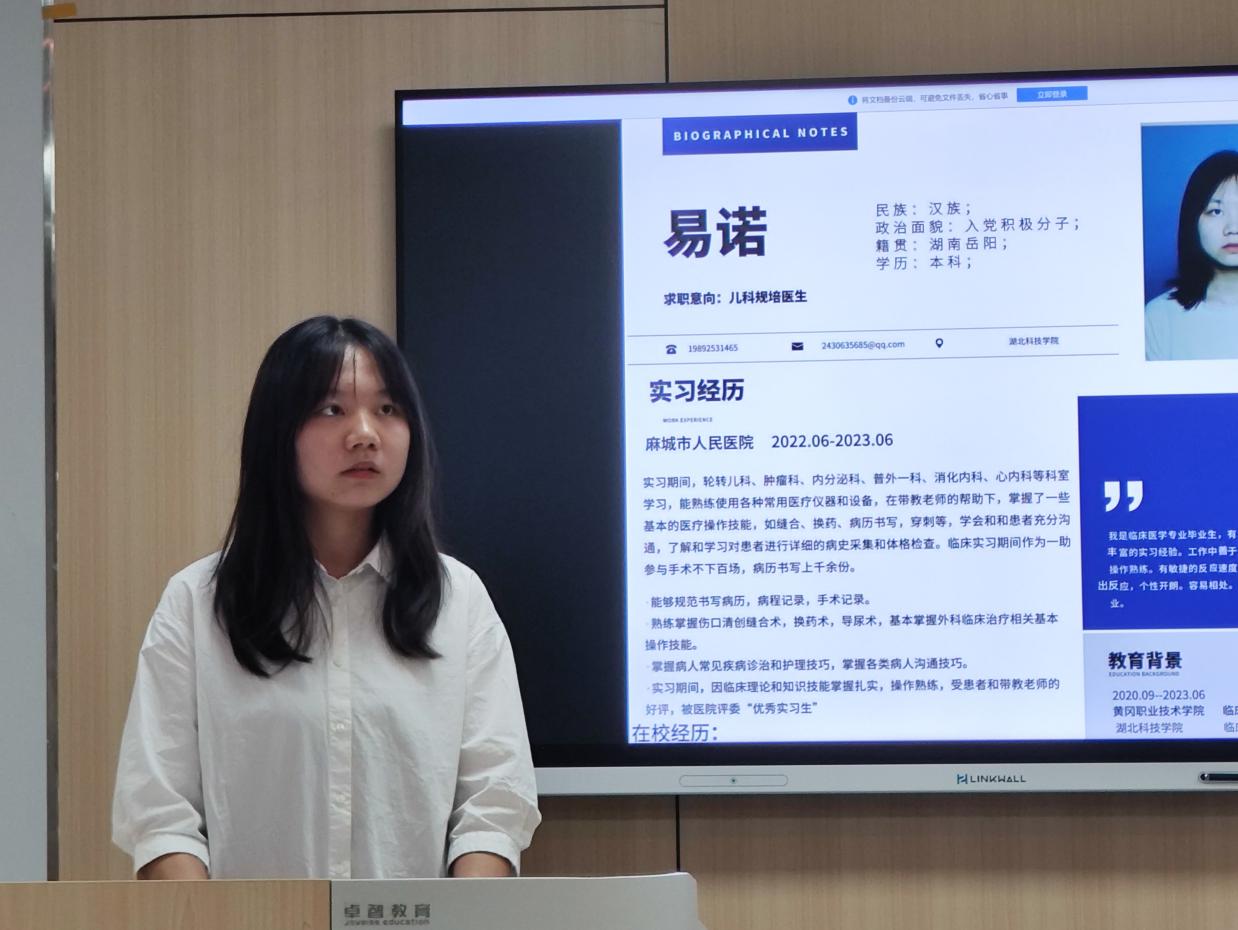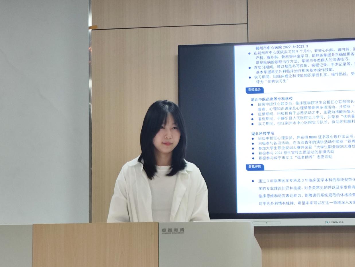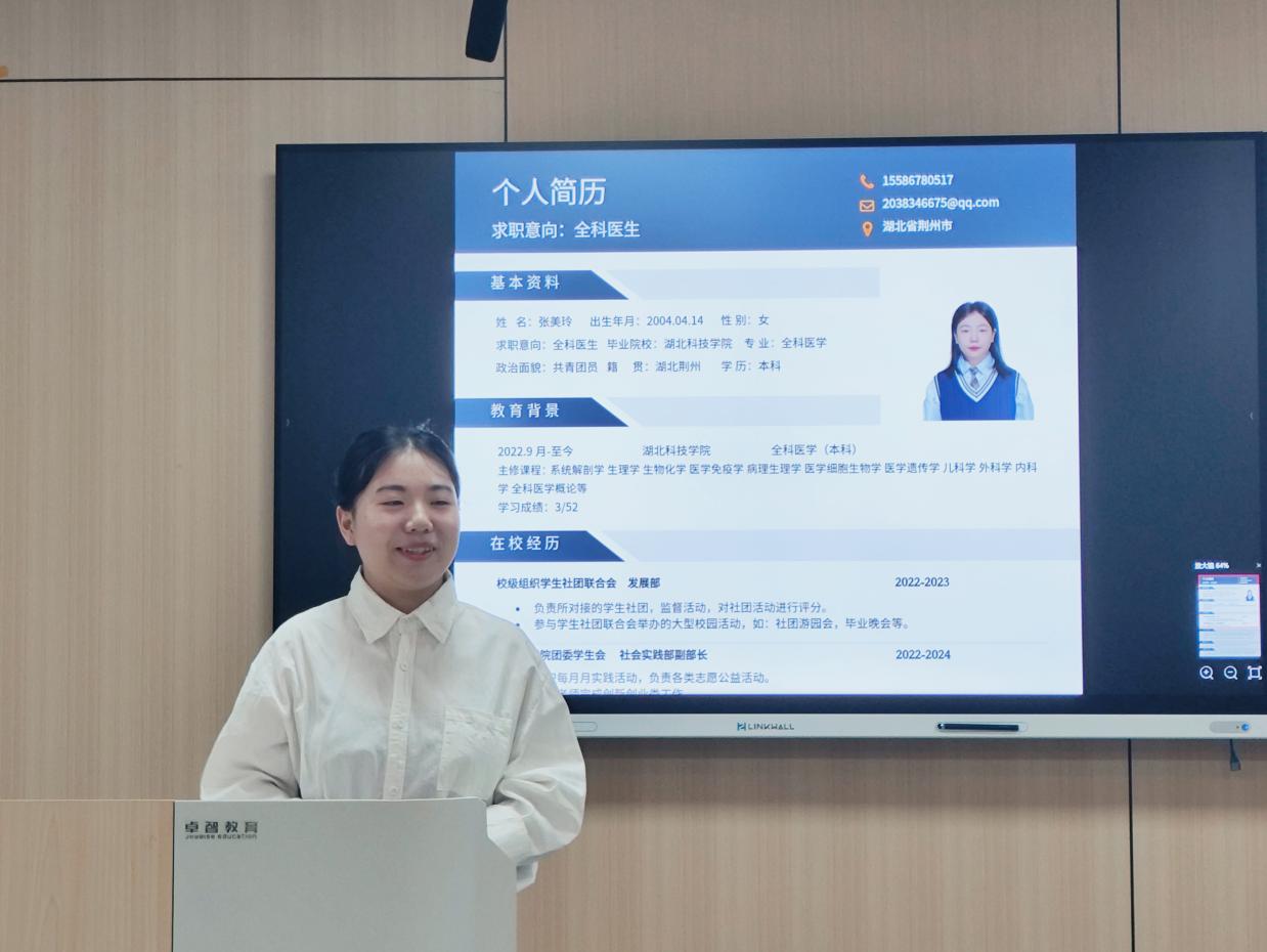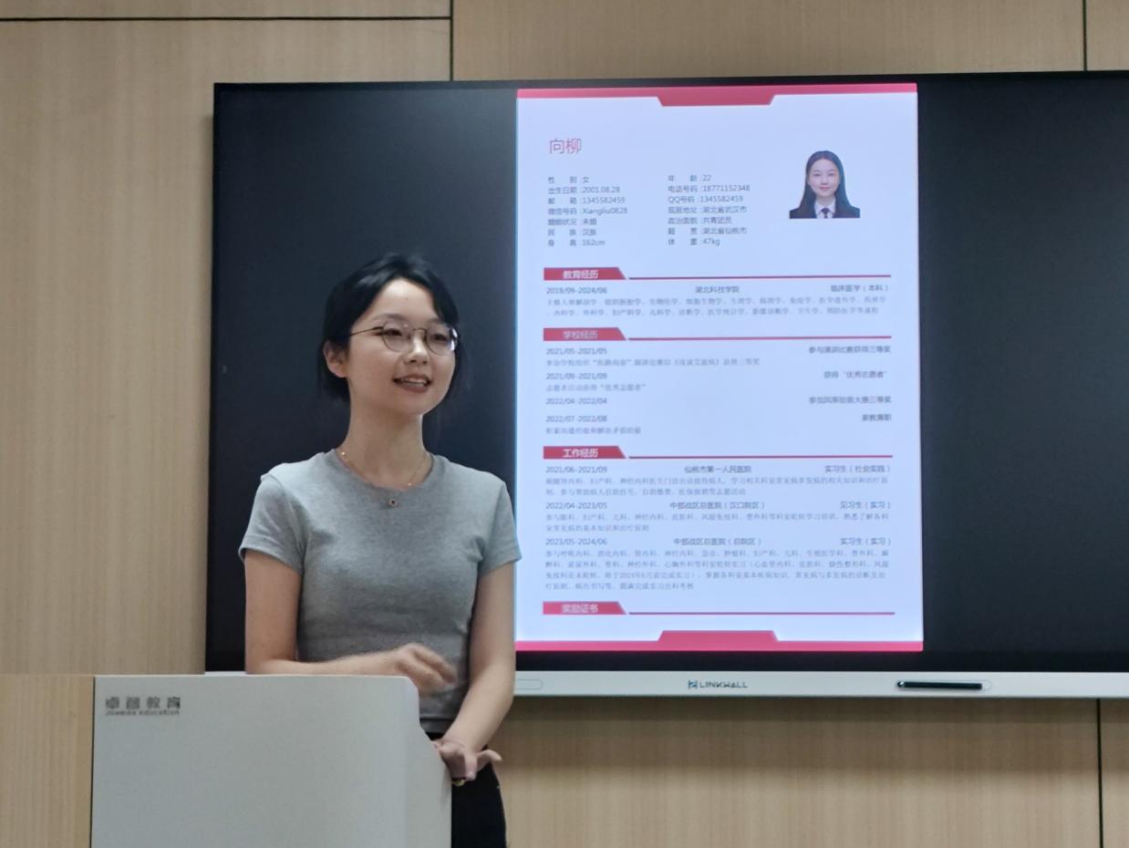 比赛当天,现场气氛热烈,观众掌声不断。五位优秀的选手向柳、胡腾、易诺、李美春和张美玲依次登台亮相。他们经过精心准备,展现出了扎实的专业知识和出色的职业素养。他们有着不一样的求职意向,但都怀揣着对医学事业的热爱和对未来的憧憬。