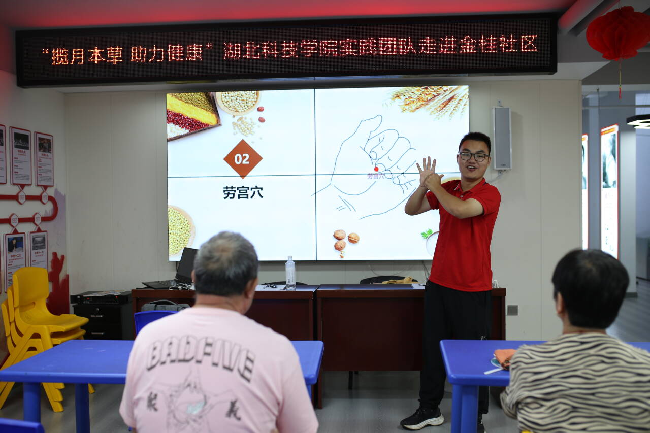 (通讯员 邓彪 审核 林相豪)7月20日,意昂体育“揽月本草,养生科普”暑期社会实践团队的志愿者来到咸宁市咸安区浮山街道金桂社区党群服务中心开展养生讲座、穴位保健科普等系列活动。