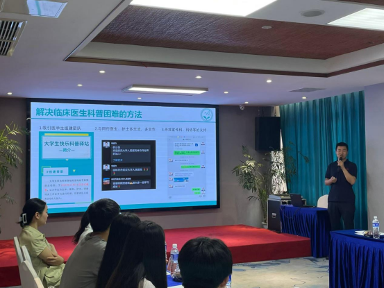 活动伊始,在周剑教授和杨盛力教授致辞后,便由杨教授进行以“繁忙的临床工作下如何做好健康科普”为主题的分享,从国家政策的引领与科普创作的意义、临床医生和员工从事科普的困境与解决方法、科普创作指导、做怎样的科普及科普成果等方面展开,并用“‘写’科普、‘讲’科普、‘宣’科普、‘践’科普”这四组词对科普的未来指明方向,以期望继续创作出大众喜爱的、有帮助的作品汇集科普成果、编辑科普书籍,以期望进一步开展科普进校园活动,同时开展好中小学科普活动,以期望通过各传播媒介和比赛,更好地将科普成果传播出去,以期望老员工用自身之所学,回馈于祖国大地。