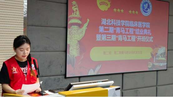 第三期“青马工程”学员付宇航同学作为新生代表进行发言,他以习近平总书记对青年的寄语“青年兴则国家兴,青年强则国家强。”为切入点,呼吁新时代青年应坚定理想信念,勇于接受挑战,在课堂学习中提高专业素养;在各项活动中磨砺个人意志;在社会实践中提升道德品质,以积极的态度和昂扬的激情投身建设伟大祖国的进程中。
