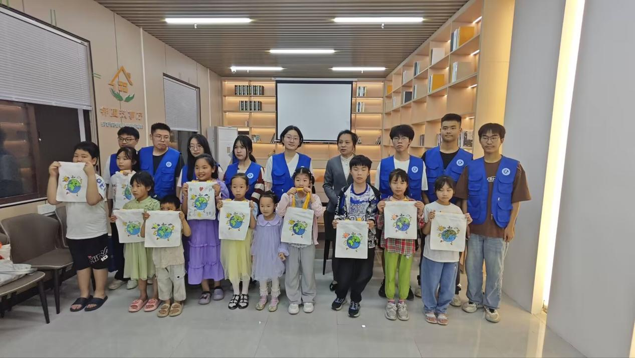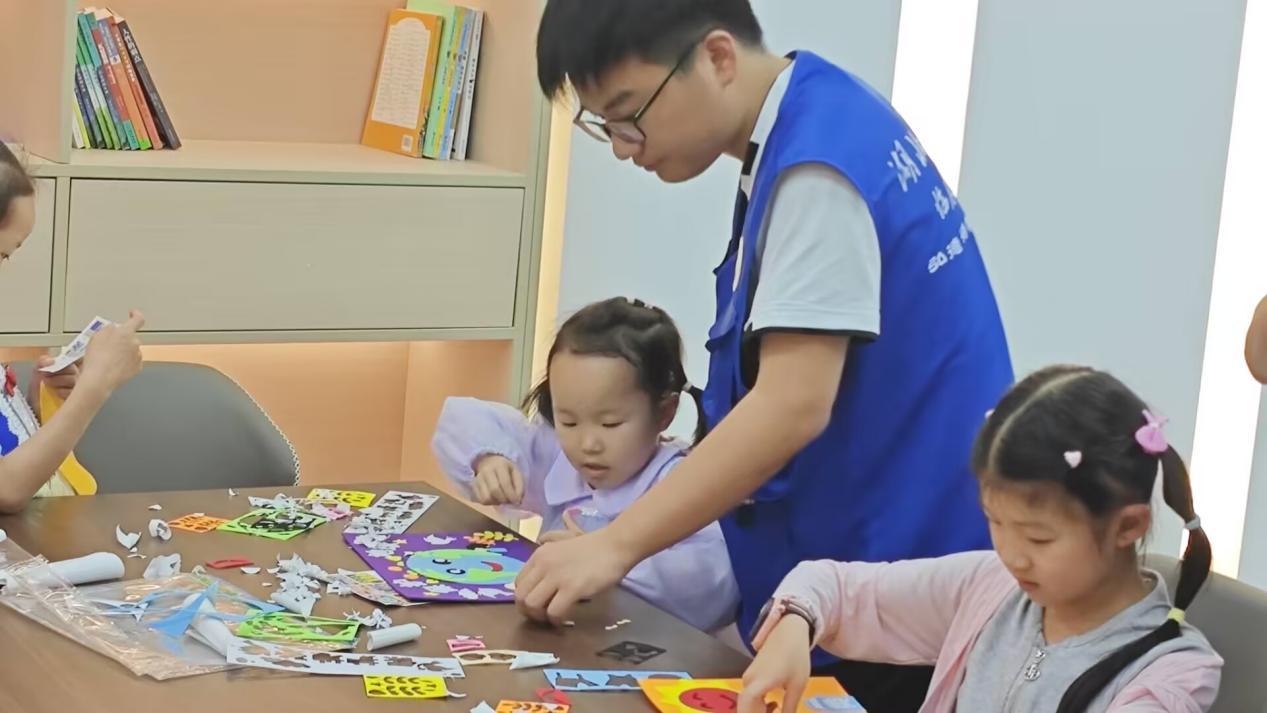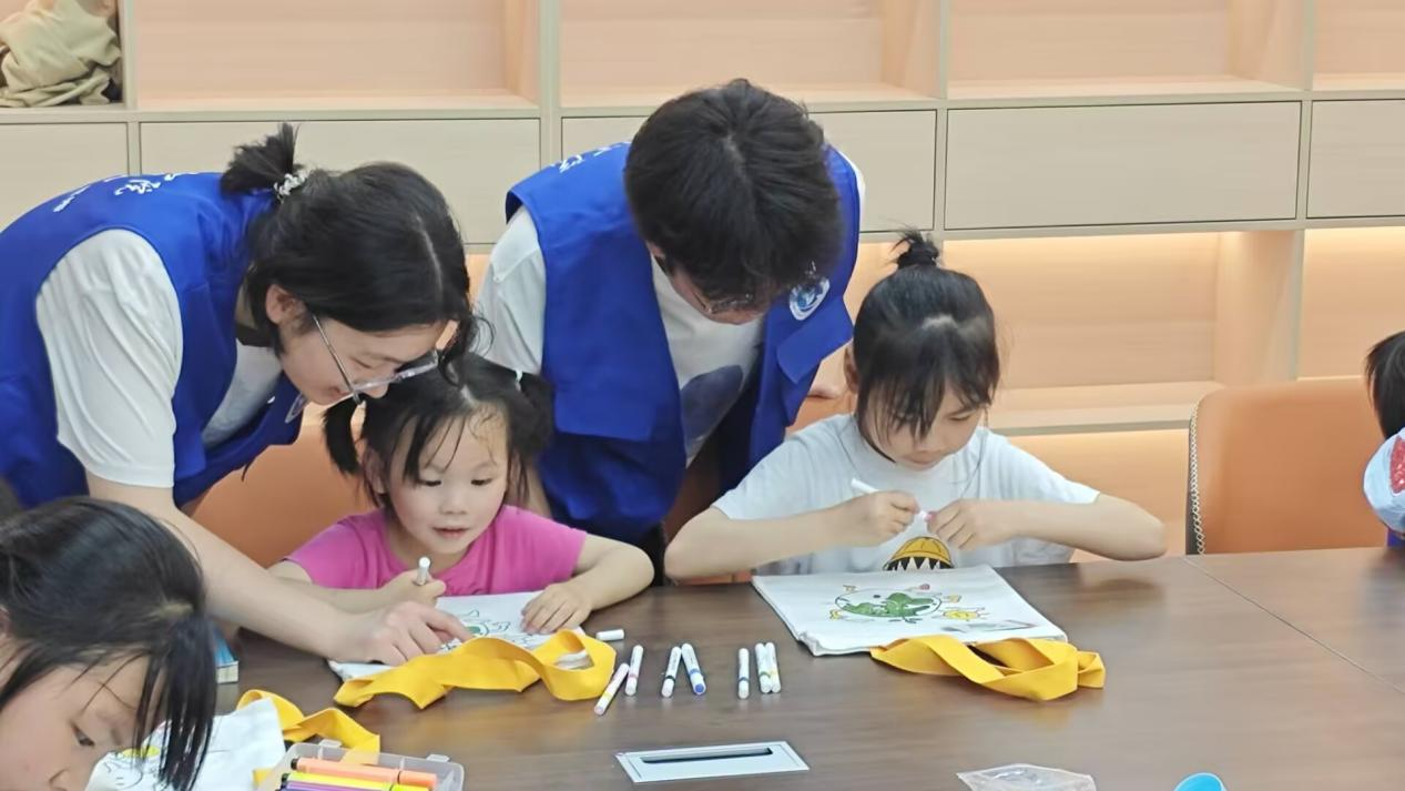 在生动的环保知识问答后,孩子们眼中闪烁着意犹未尽的光芒。这时,志愿者们神秘地拿出准备好的“小礼物”,进入了手工环节。手工桌上铺满彩纸与贴纸,孩子们围坐成圈。志愿者穿行其间,孩子们全神贯注地跟着贴纸,当贴纸完成,初生的太阳、重叠的云朵在卡纸上次第绽放,最终化作一幅幅天马行空的地球画卷。彩纸纷飞间,志愿者郑文博始终穿梭在孩子们身旁,每当发现有孩子对着贴坏的图案发愁,他总会立刻俯身靠近,轻声询问:“需要哥哥帮你调整一下贴纸角度吗?”温柔的话语伴着鼓励的笑容,及时化解孩子们的困惑。除了贴纸和彩纸在飞舞,诞生出一个个可爱的画卷外,志愿者准备的环保袋也成了孩子们的“创作天地”。孩子们围坐在一起,手中紧握着画笔,眼神专注地盯着环保袋上的地球图案。他们小心翼翼地涂色,为地球添上象征生机的绿色、代表纯净的蓝色。