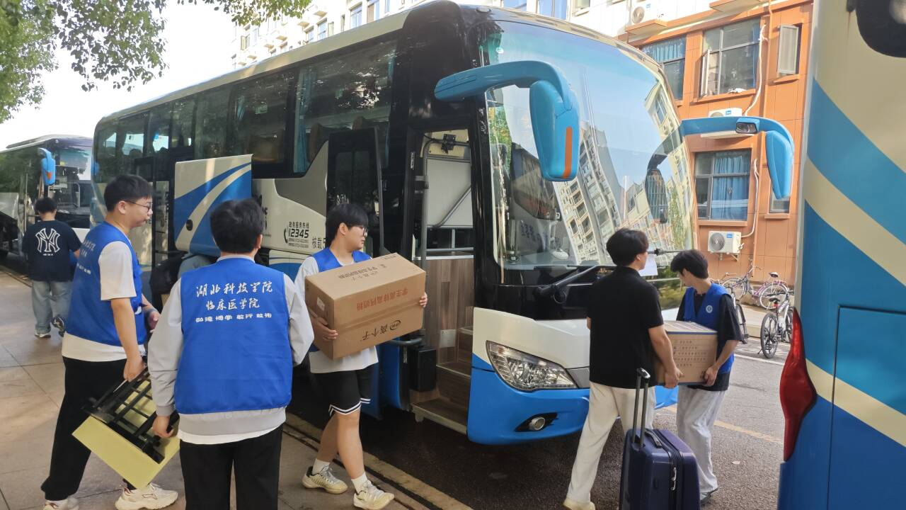 活动当天,晨曦微露,西区食堂门前呈现出一派生机盎然的景象。整装待发的医员工们精神饱满,整齐排列的大巴车蓄势待发,勾勒出一幅青春奋进的生动画面。在送行工作中,志愿者们以高度的责任感和饱满的热情,构筑起一道温暖的保障线。他们或穿梭于宿舍楼宇间细心搬运,或驻守车旁严谨装运,用坚实的臂膀托起同窗的梦想,以实际行动诠释着团结互助的医学人文精神。