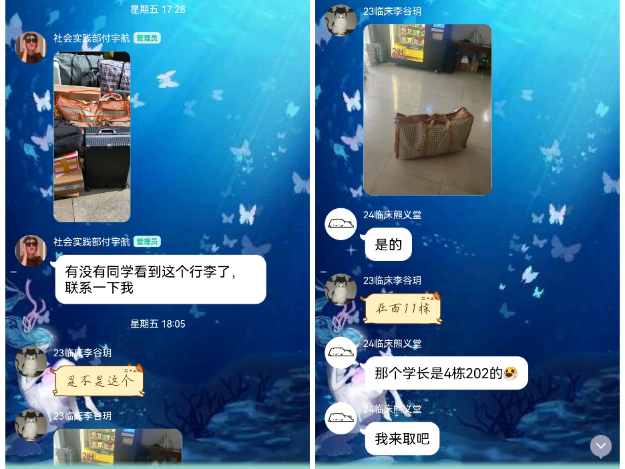 忙碌人群中,上演着温暖插曲。社会实践部管理员付宇航在志愿者服务群中焦急询问:“有没有同学看到此件行李了,麻烦联系一下我。”并附上行李照片,原来是一位毕业生不慎遗落了行李。消息刚发出,23临床李谷玥同学立刻回应,发出自己所拍行李照片询问:“是不是这件行李呀?”随后,24临床熊义堂同学也加入对话,笃定道:“那位学长住在4栋202,我去取吧。”几句简短的交流,没有多余的话语,却满是同学间的深厚情谊。在大家齐心协力下,行李迅速寻回,交到毕业生手中。这一幕,尽显员工会的工作负责和志愿者的满腔热心。