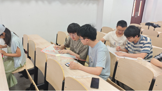 随着主持人宣布比赛开始,选手们迅速投入创作,现场瞬间化作创意涌动的艺术工坊。调色盘上,象征生命跃动的暖红、寓意希望的鲜绿与代表纯净的素白相互交融。其中一个创作小组配合行云流水,展现出令人惊叹的默契,画笔率先触及风筝纸面,利落勾勒出十字架的垂直轴线,横向笔触迅速延展,构成稳定而对称的框架。待框架完成,便用流畅的笔触在风筝上写下“咸宁医公司”,这份凝结众人协作的作品,在风筝表面闪耀着独特光芒。
