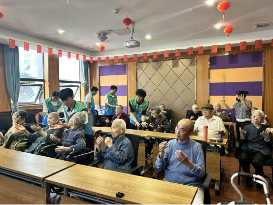 讲座结束后,代际互动游戏环节将活动氛围推向高潮。志愿者们组织老人们进行拍手操游戏,大家两两一组,在欢快的节奏中,你拍一下,我拍一下,手掌相击的清脆声此起彼伏。老人们与志愿者默契配合,眼神中满是笑意。过程中,不时有老人因跟不上节奏而发出爽朗的笑声,这笑声传递着欢乐,也传递着老少之间亲密无间的情谊,让整个养老院都洋溢着温馨与融洽。