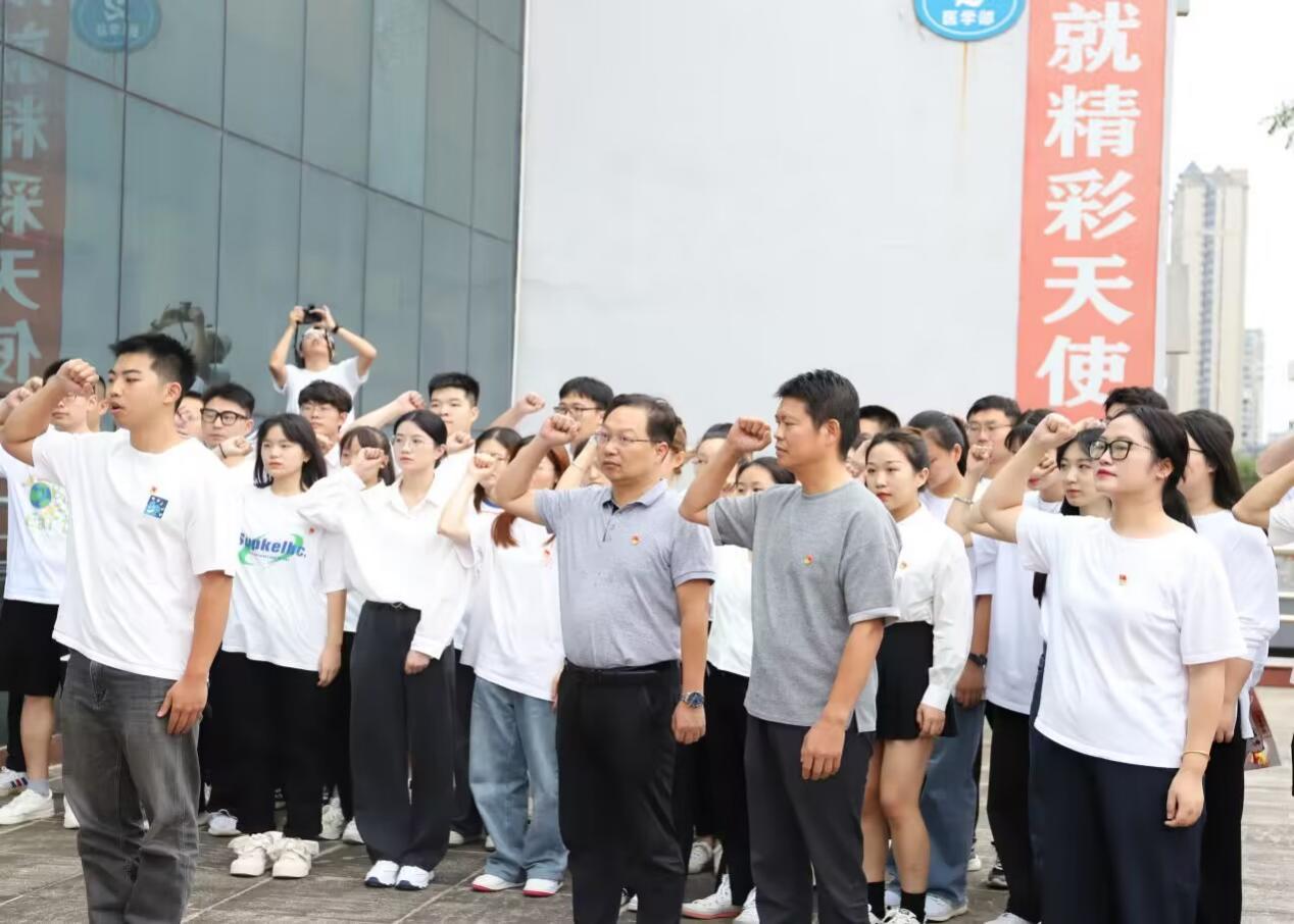 公司党委书记魏旻杰带领老师和员工党员们在党旗下庄严宣誓。朱凌瑀同学领誓,新发展党员列队肃立、面对党旗进行入党宣誓,老党员重温入党誓词。