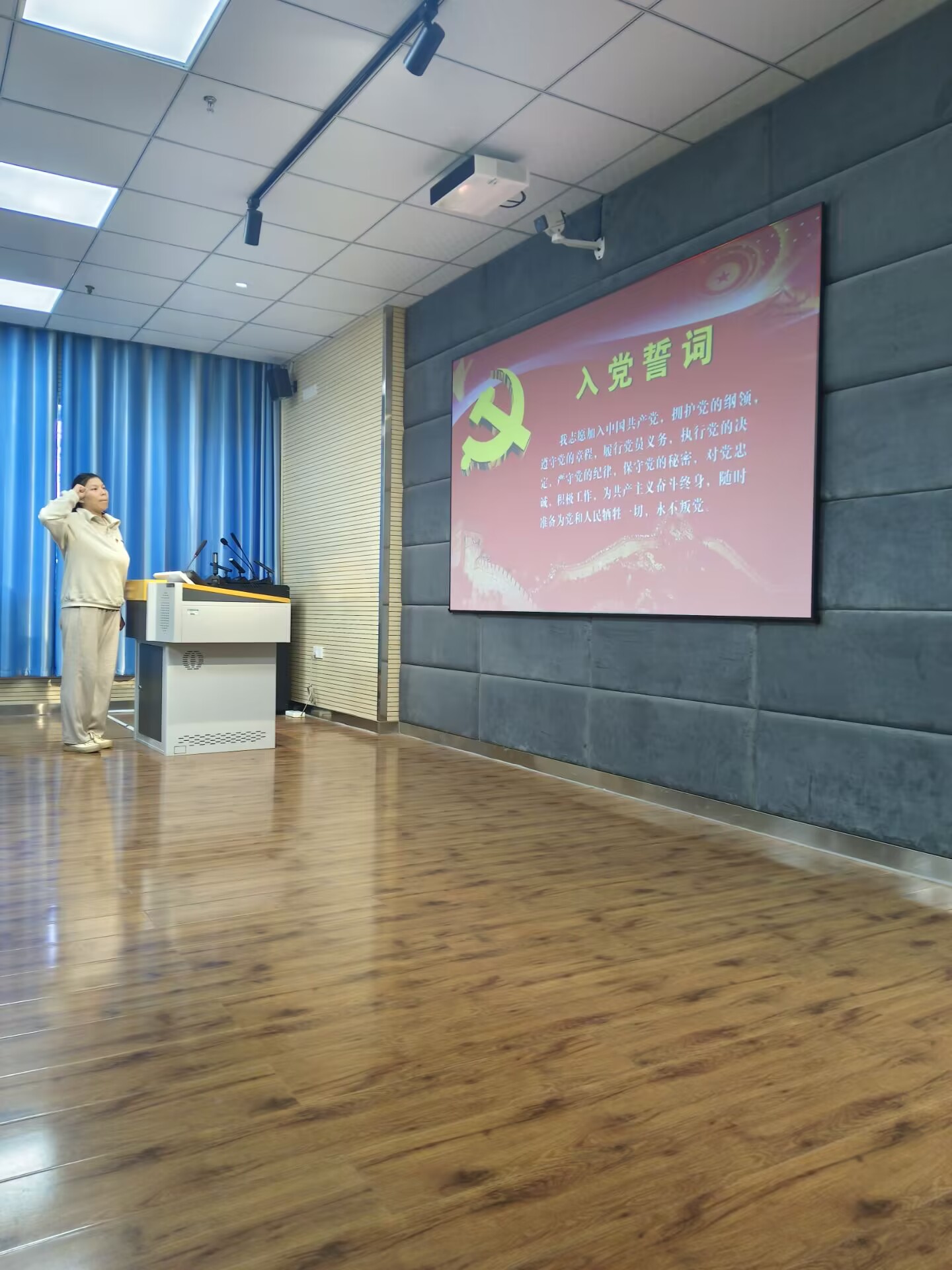 大会在庄严的国歌声中拉开序幕。全体党员肃立,目光坚定,共同重温入党誓词。