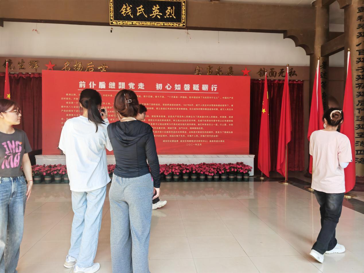 在前往钱氏英烈纪念馆的途中,大家怀着崇高的敬意了解了钱氏英烈的英勇事迹。纪念馆内,一幅幅珍贵的历史图片、一段段感人的文字资料,一件件宝贵的历史文物打开了通向历史的窗户,透过这扇窗户我们望见钱氏英烈们为革命事业抛头颅、洒热血的壮丽篇章。其中有位同学感慨道:这里有女同志!钱远洁,1927年2月当选为咸宁县妇联主席,制定了《禁止缠足条例》等,宣传大脚、不穿耳、剪短发、男女平等、自由恋爱等思想,号召妇女团结起来同封建思想作斗争。由于反动分子告密,1927年11月中旬的一天,保卫团突然闯到钱家,抓住了钱远洁。他们要将她带走,钱远洁说:“我不走,我生在钱家庄,也要死在钱家庄,要杀现在就杀,要从我嘴里得到半点情况那是妄想!”接着,她宣唱《国际歌》,敌人无计可施,就用铁丝穿其乳房,拉着她游乡示众,强行把她押到钱家庄村口一块刚收割的稻田边要她下跪。她愤慨而坚定地说:“我们共产党人要死就站着死,没有跪着死的!”接着,她昂首挺胸奋力高呼:“打国民党反动派!中国共产党万岁!”最后她含笑倒在血泊中。讲解员说道钱氏英烈纪念馆最先就是从女同志开始的。听完这些大家感慨万千,再一次为革命党人的精神与毅力所震撼,大家纷纷表示,要学习先烈们的革命精神,不忘初心,牢记使命,为党和人民的事业贡献自己的力量。