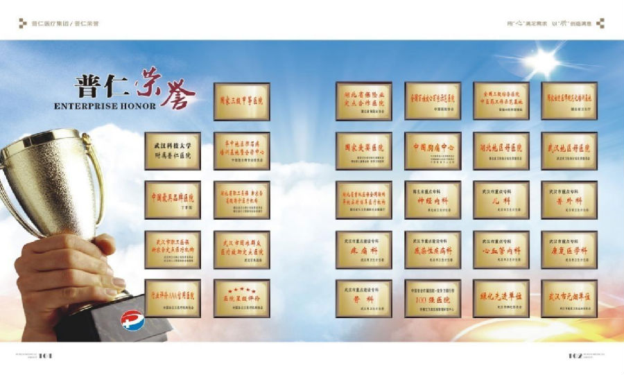 武汉市普仁医院是武汉科技大学附属医院、第四临床公司,是“全国三级综合医院中医药工作示范基地”、国家“胸痛中心”、“心衰中心”、“卒中中心”、国家“爱婴医院”,“武汉市文明单位”、“武汉市物价信得过单位”、“湖北省绿化红旗单位”,2015年被评为“湖北地区好医院”和“武汉地区好医院”。2017年通过三级甲等医院评审,2020年通过互联网医院评审,获得“中国医院竞争力星级认证五星级医院”,中国非公立医疗机构协会“行业评价AAA信用医院”,中国非公立医疗机构协会“医院星级评价五星级院”。