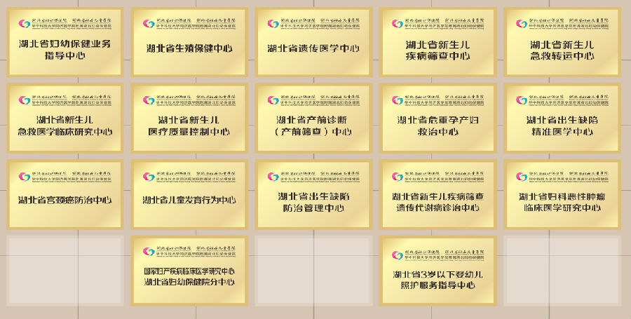 医院设一级临床科室34个,医技科室6个,保健科室4个,二级专科近60个。设有湖北省产前诊断中心、湖北省出生缺陷精准医学中心、湖北省宫颈癌防治中心、湖北省遗传医学中心、湖北省新生儿疾病筛查中心、湖北省新生儿急救转运中心、湖北省危重孕产妇救治中心、湖北省新生儿急救医学临床研究中心、湖北省新生儿专业医疗质量控制中心、湖北省儿童发育行为中心、湖北省出生缺陷防治管理中心、湖北省新生儿疾病筛查遗传代谢诊治中心、湖北省妇科恶性肿瘤临床医学研究中心、湖北省3岁以下婴幼儿照护服务指导中心等多个中心。